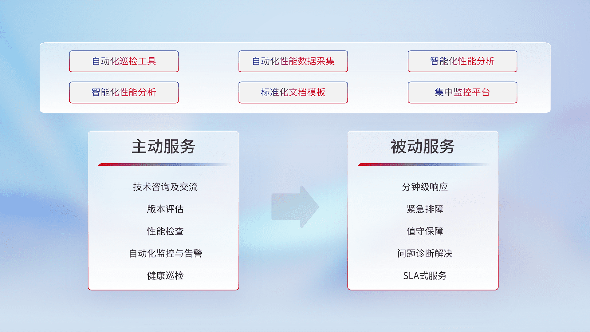 智能化工具和标准化文档,,保障服务质量,,,提供主动服务(包含技术咨询、、版本评估、、、性能检查、、、自动化监控与告警、、、、健康巡检)和被动服务包含(分钟级响应、、、紧急排障、、、、值守保障、、问题诊断解决、、、SLA服务)。。。