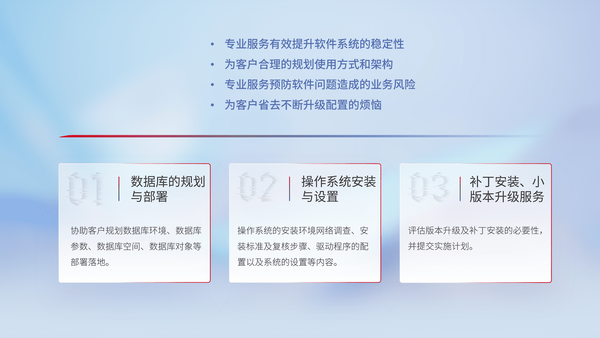 为客户提供软件规模升级、、、快速部署、、、按需配置的专业服务,,,从数据库的规划与部署到操作系统的安装与设置,,,再到补丁安装和小版本升级提供支持。。